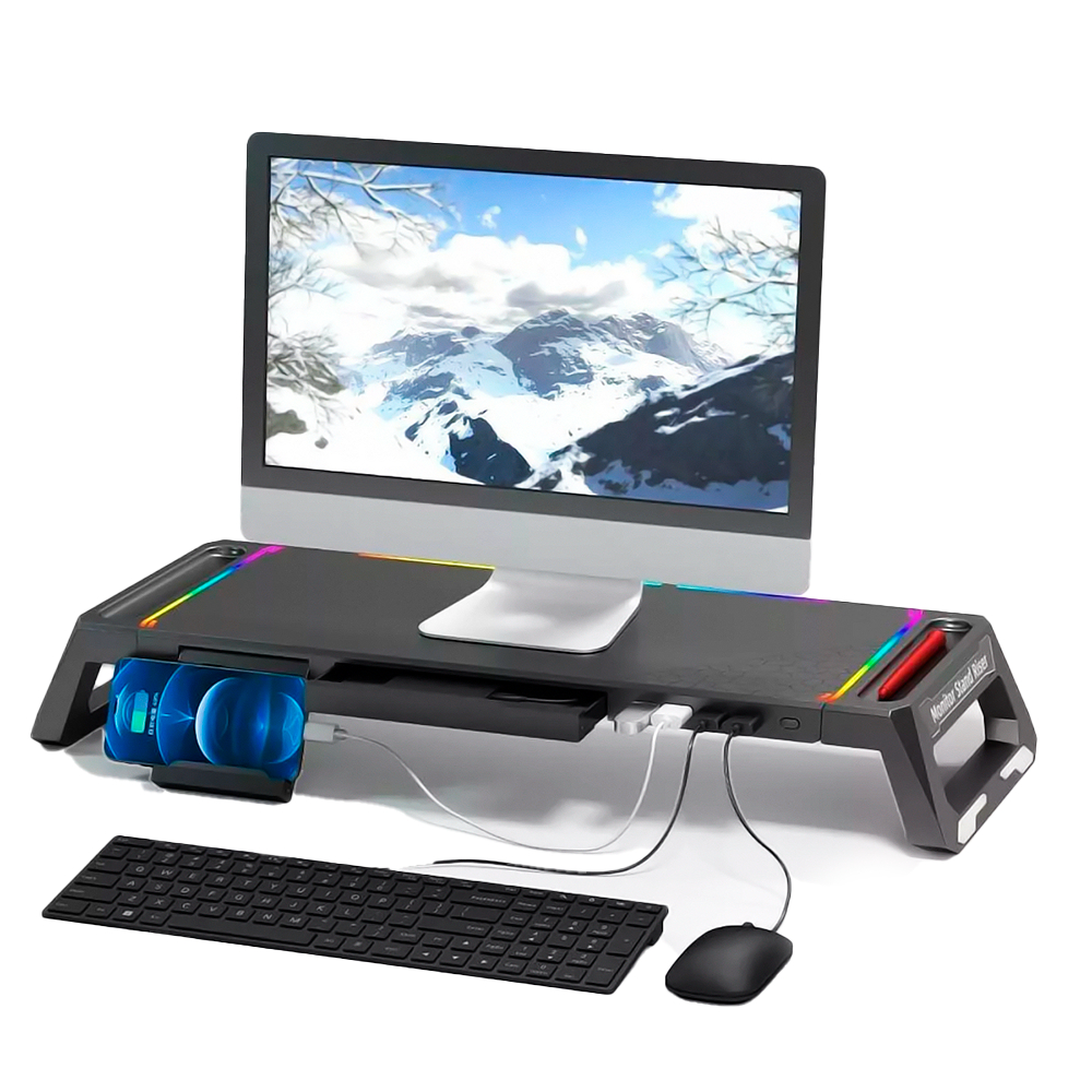 Suporte Monitor PC Computador Notebook Tv Multifuncional LED RGB 4 Portas Usb 3.0 Gaveta Celular