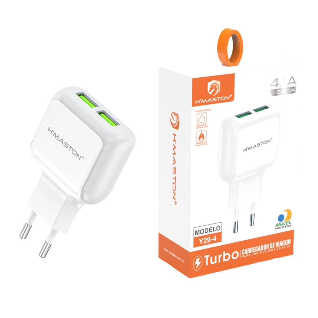 H'maston Y29-4 Carregador 2 USB 4.1A Turbo Saída 5V2A Entrada 100-240V, Aprovado Pela ANATEL, a Qualidade Original do Produto é Garantida Para iPhone X/11/12/13 Série, Android Samsung, Galaxy