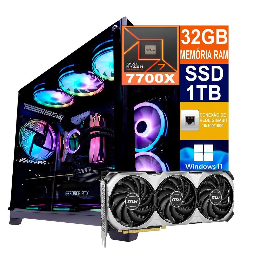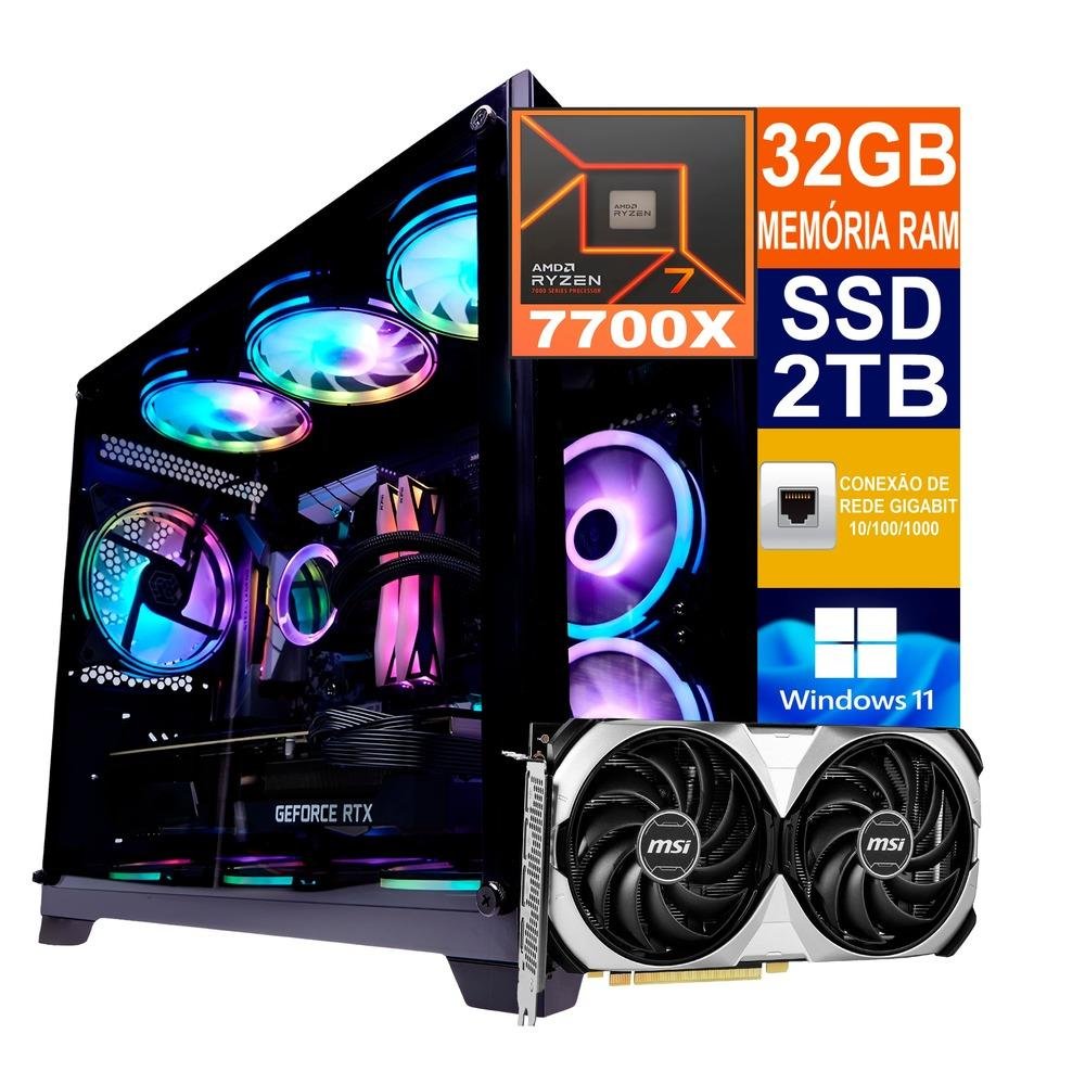 Computador Tech Power Shop Ryzen 7 7700x, 32GB RAM, DDR5, Placa RTX 4070ti 12GB, Placa Mãe B650m, SSD 1TB, M2, NVMe, Water Cooler 240mm, Fonte 750w, Windows 11 Pro 64bits