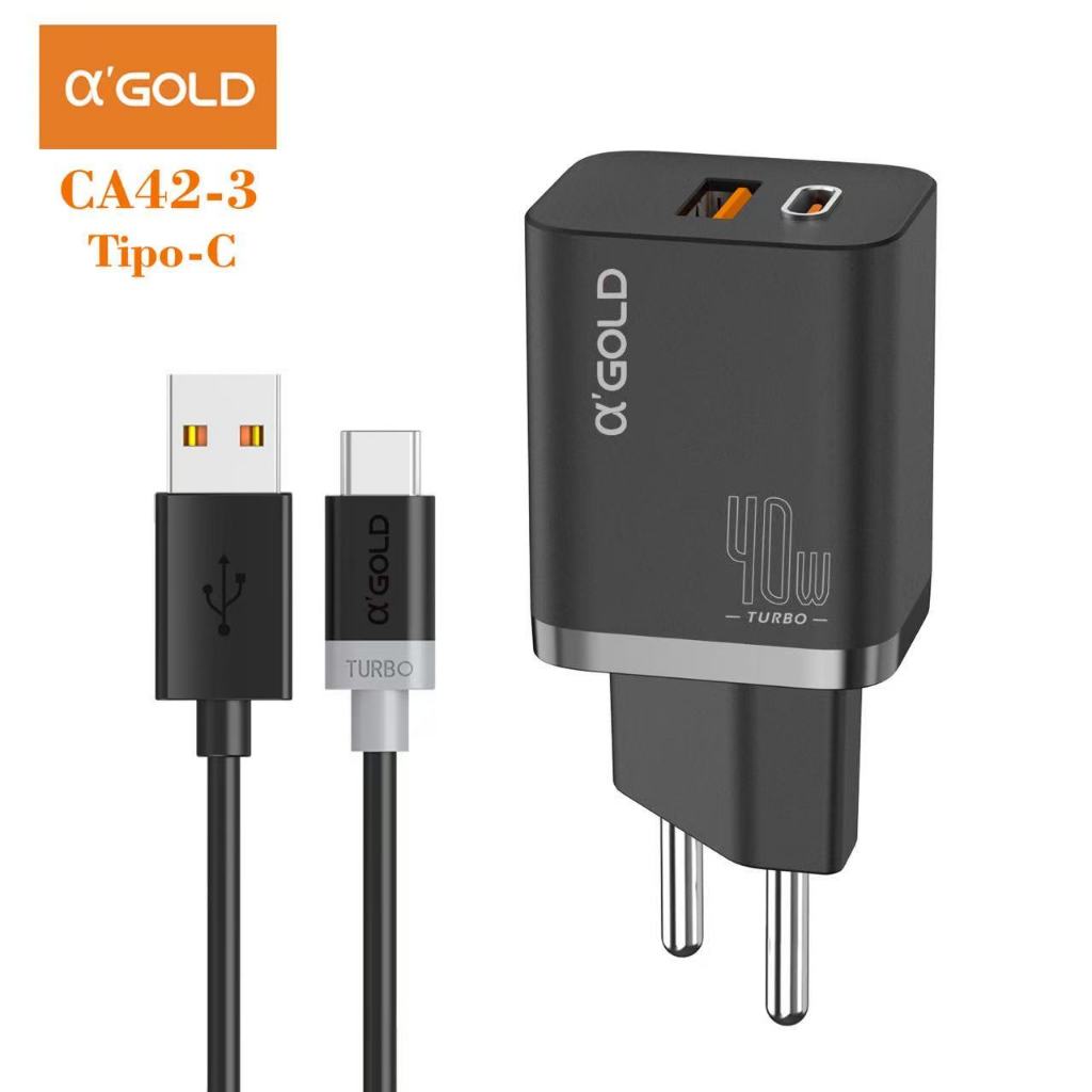 Kit carregador turbo 9.1A 40W PD 3.0 com cabo Tipo-C toamda com 2 entrada USB-A / USB-C