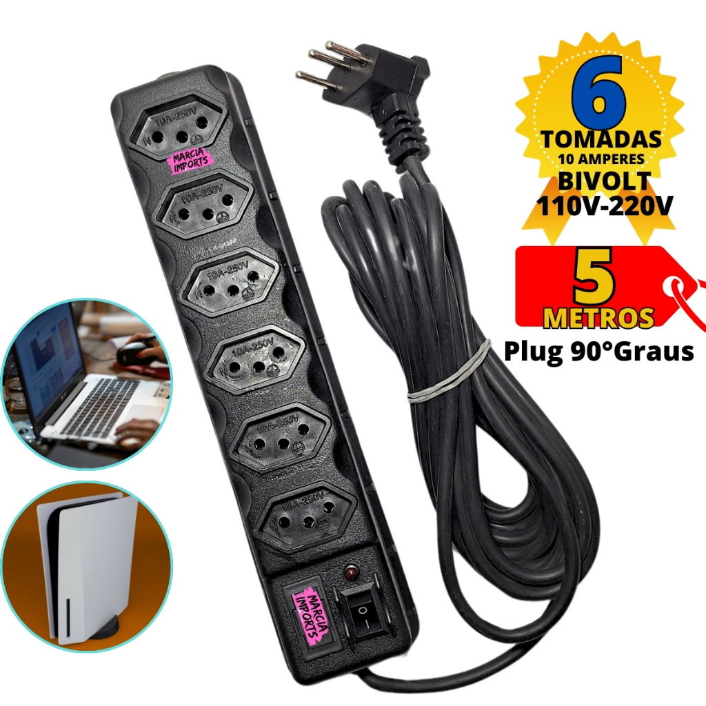 Regua Eletrica Bivolt 6 tomadas com 5 metros de cabo com plug 90°graus Filtro de Linha 10A