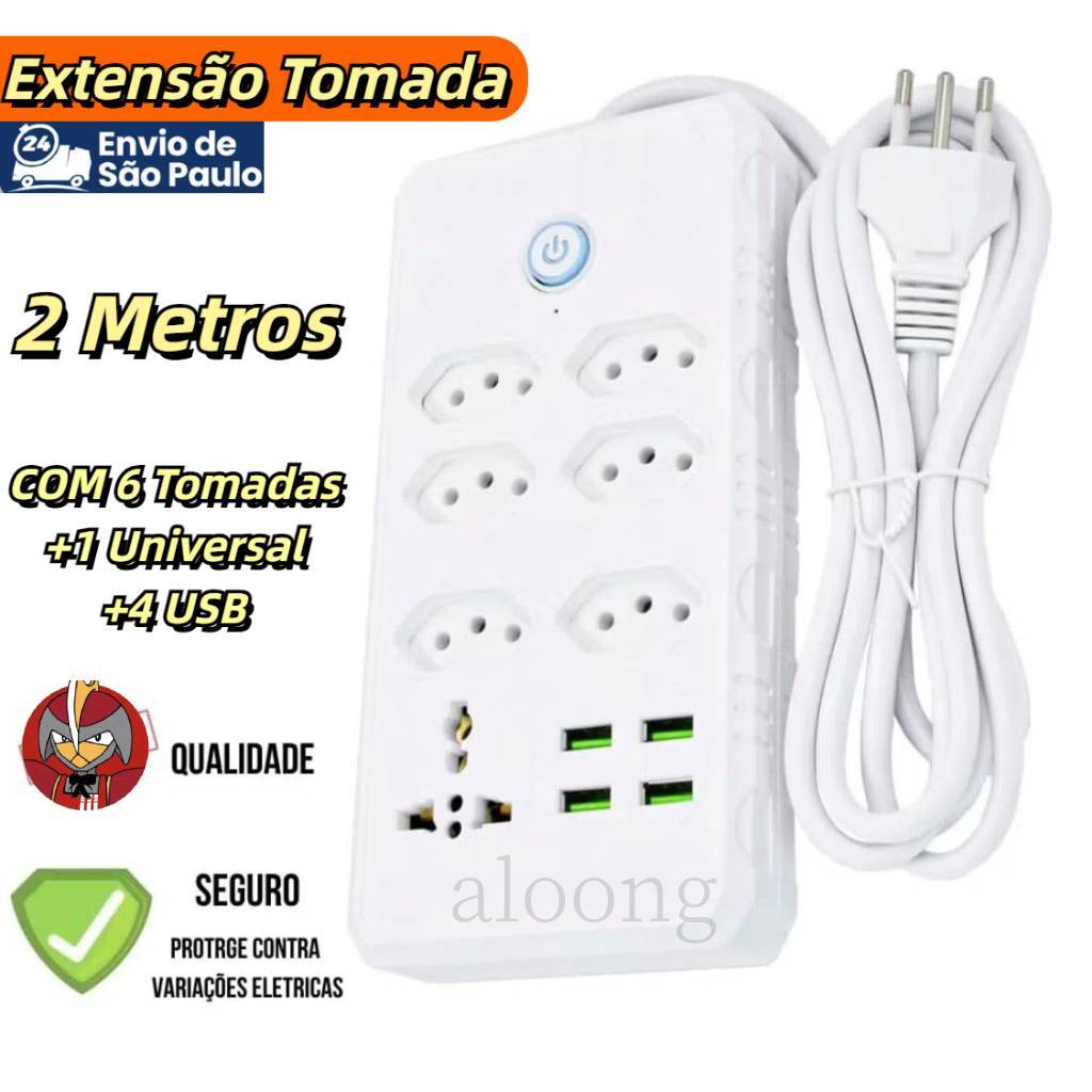 Régua Filtro de Linha com 7 Tomadas Extensão Elétrica 1 Universal 4 USB Bivolt 10A 110v/220v Cabo de 2 Metros Seguro e confiável