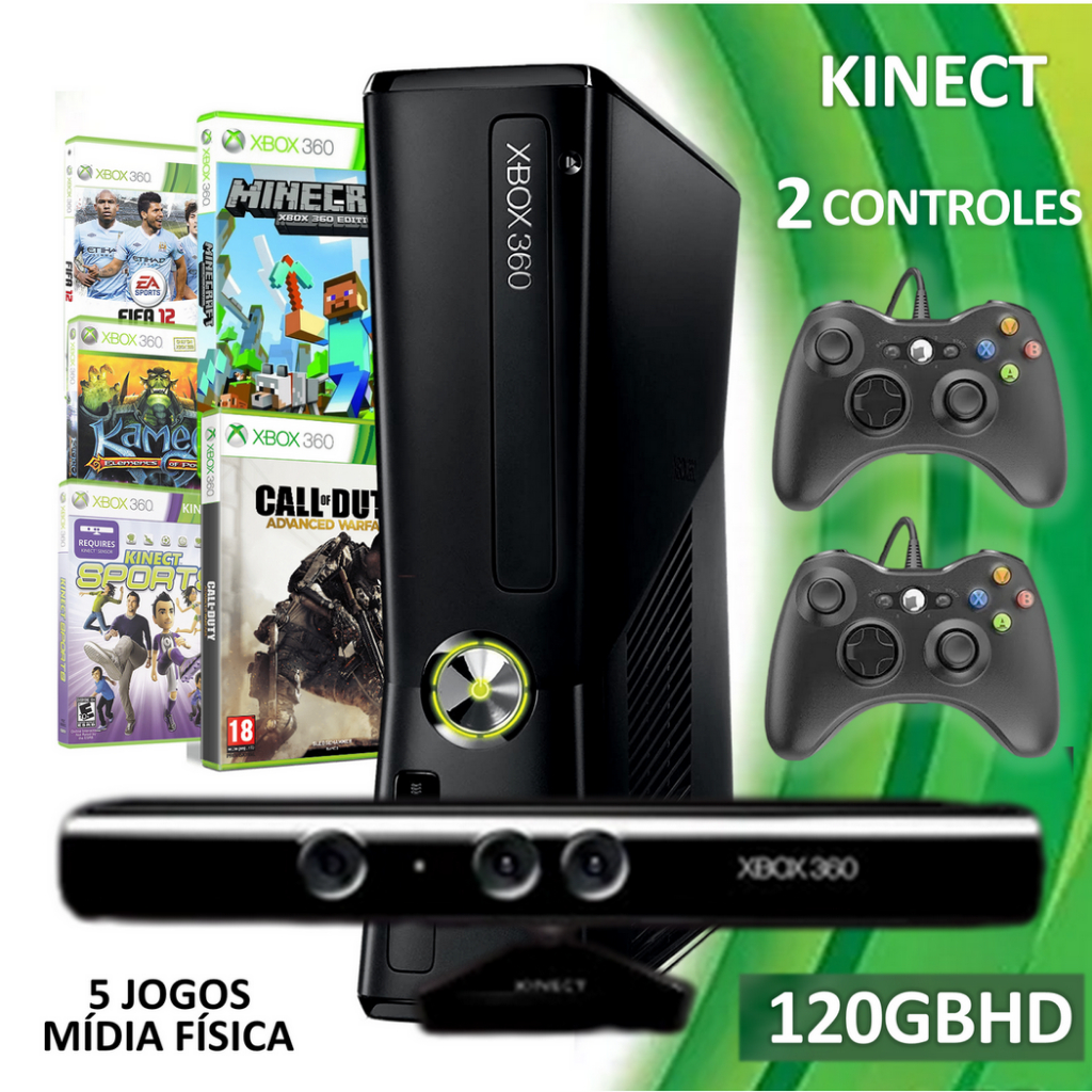 Console Xbox 360 Slim + 2 Controles + Kinect + 5 Jogos