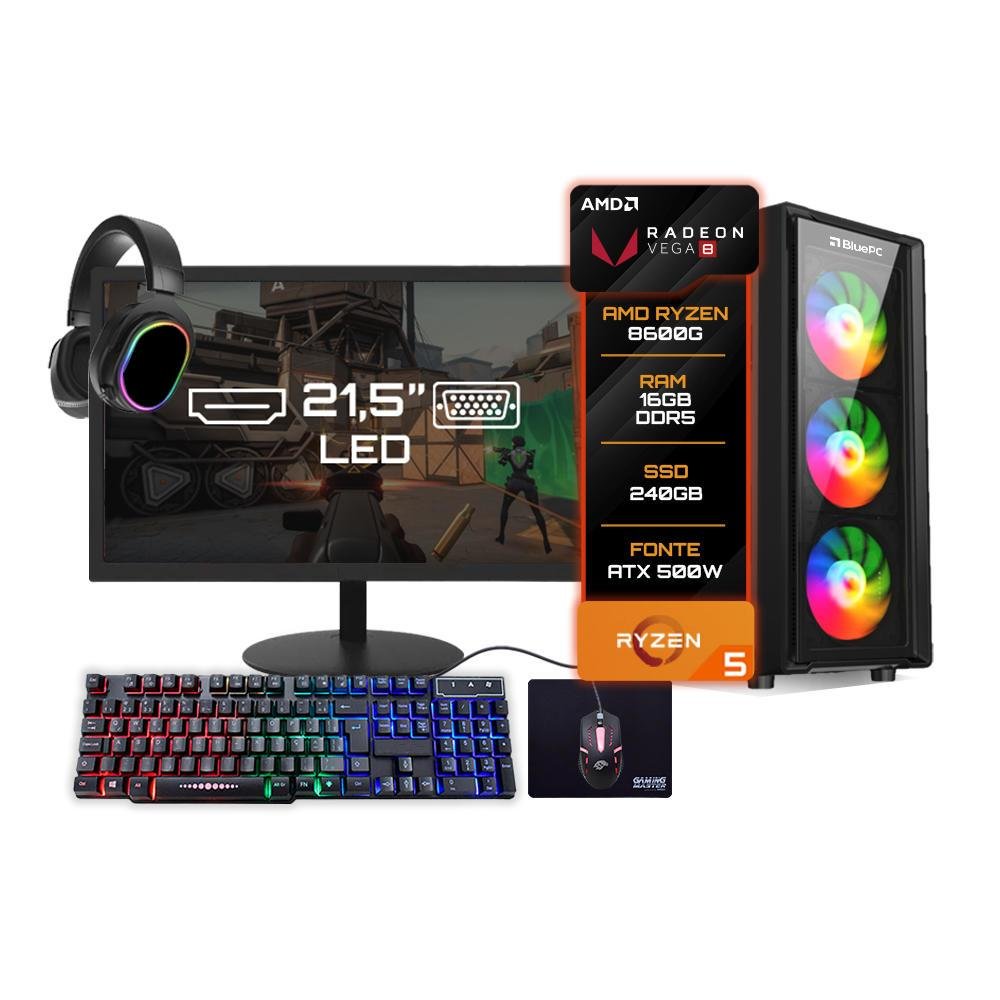 PC Gamer Completo BluePC Amd Ryzen 5 8600g 16gb Ddr5 SSD 240GB Monitor 21" - Kit Gamer Teclado Mouse Headset