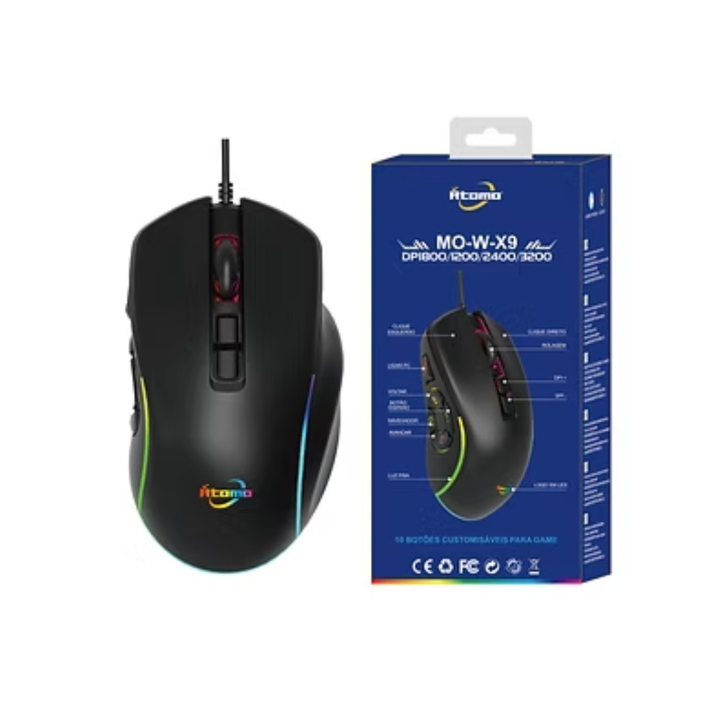 Mouse Gamer RGB com Fio MO-W-X9 – 10 Botões, 1200/1800/2400/3200 DPI e LED Iluminado