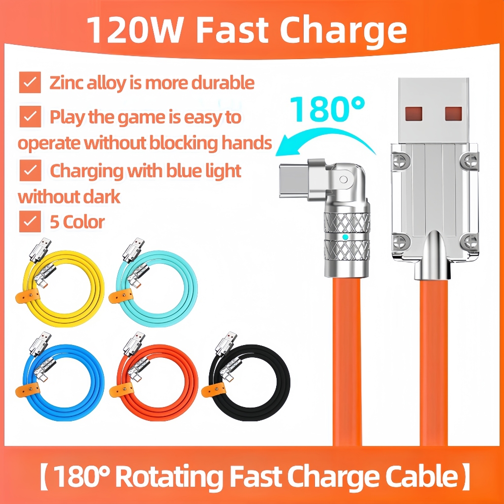 180 ° Tipo C 120 W 6A Cabo de silicone líquido de carga super rápida Carga rápida, 5 cores, conector rotativo flexível para tipo C, para, para micro-Usb, R (1M/2M)
