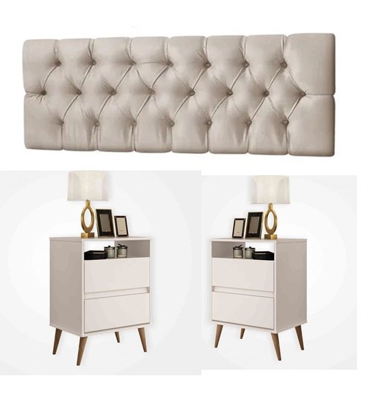 Conjunto Cabeceira Painel Paris 1,40 Capitone com Mesas de Cabeceira Lotus 2 Gav Off White - Rede Mó