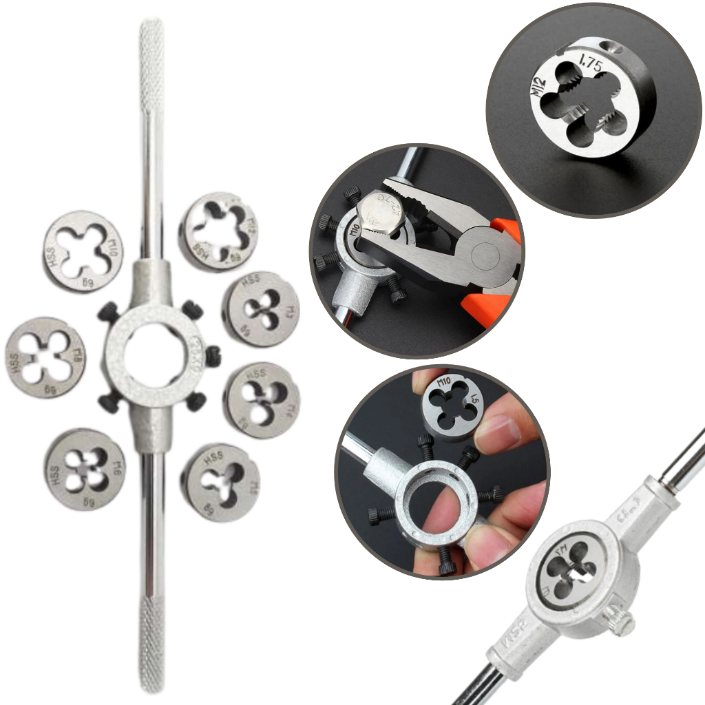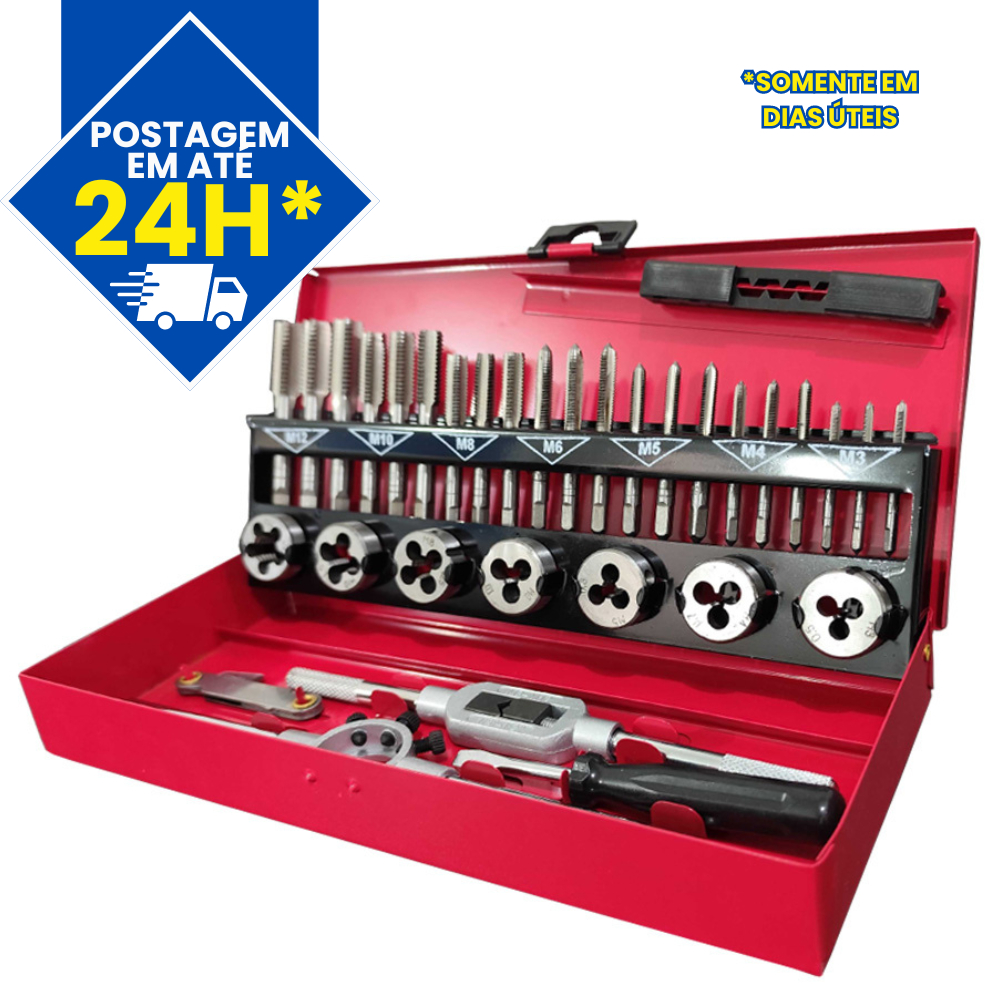 Jogo Macho e Tarracha Tarraxa Cossinete 32 Peças Aço Rapido GCR15 Profissional Metal Ferro