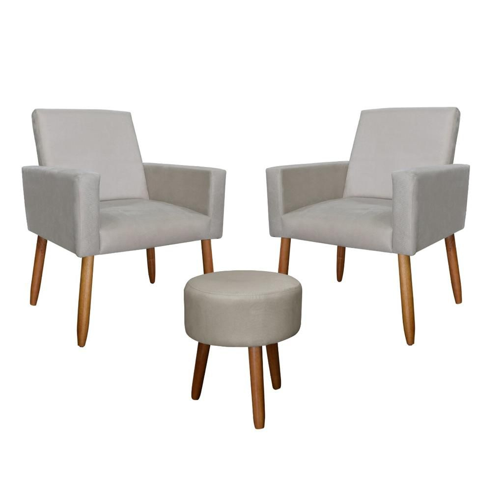 Kit 2 Cadeira poltrona Moderna mais Puff redondo decorativo suede bege