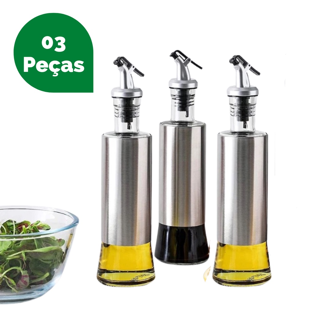 Kit 3 Galheteiros Porta Azeite e Vinagre de Vidro e Aço Inox com Bico Dosador