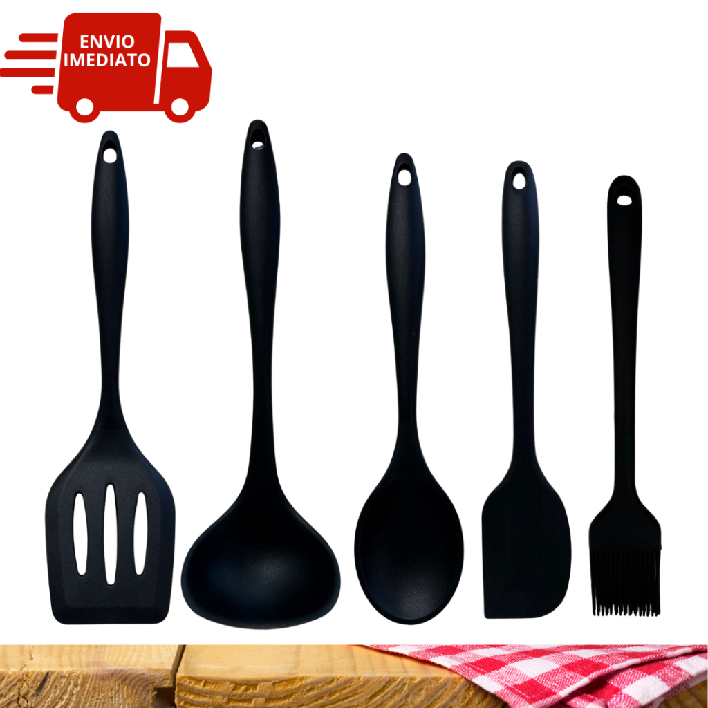 Jogo de Cozinha Kit 5 Peças Colheres de Silicone Utensílios de Silicone Para Cozinha Preto Espátula Concha Colher Premium