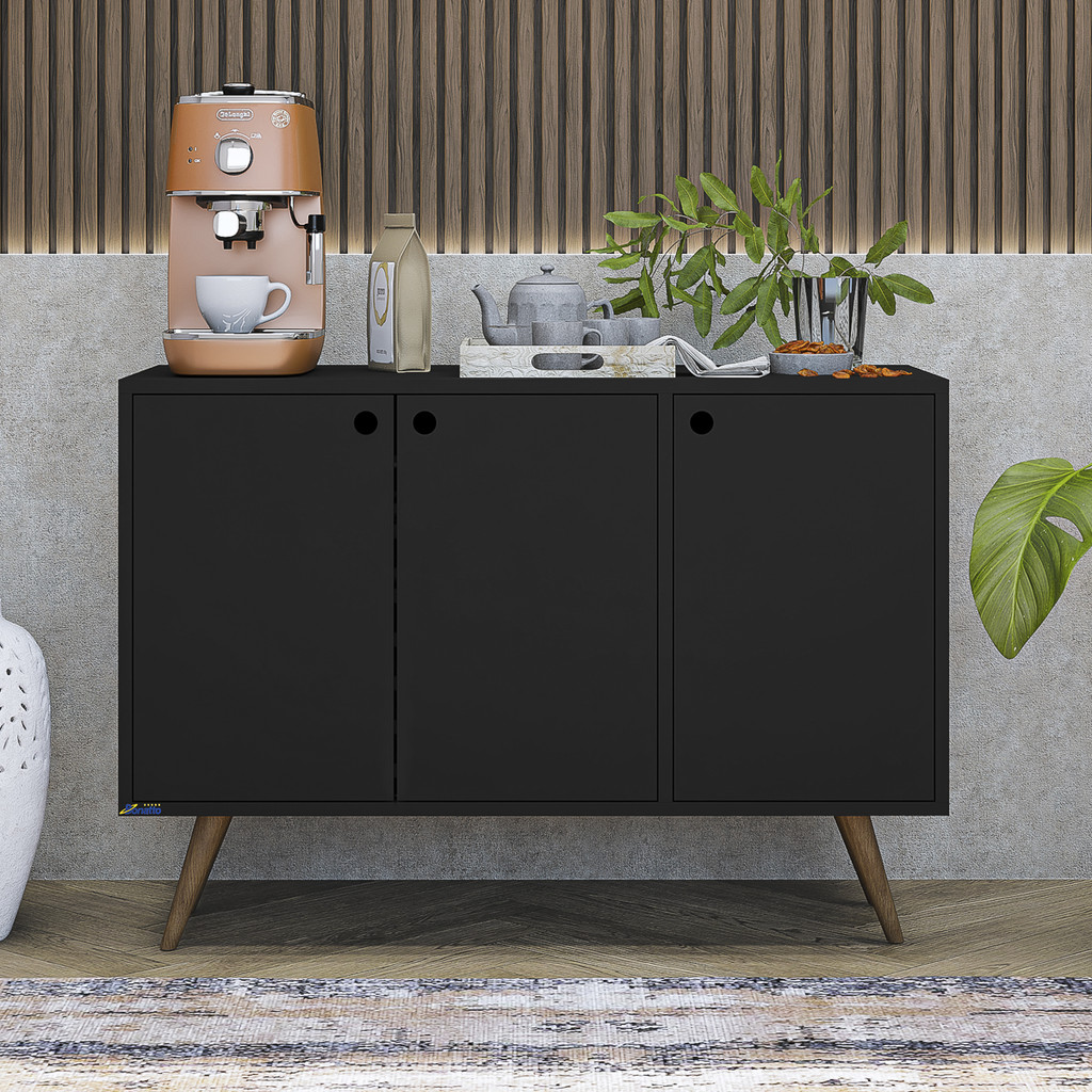 Aparador Sala Retrô Pés Palito Em Madeira Maciça buffet para casa - Lyon 3 Portas - Preto Com Madeirado