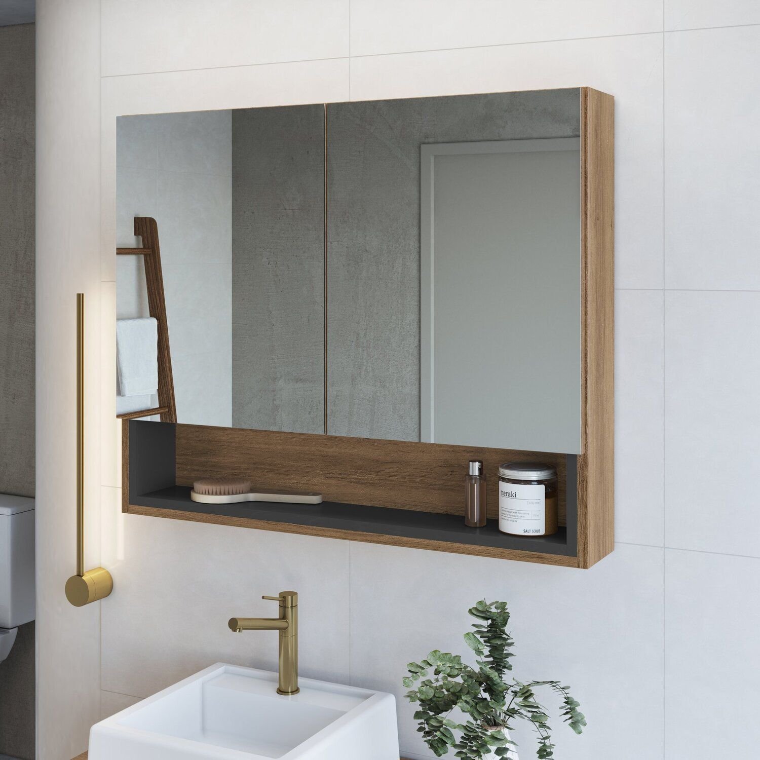 Armário Espelheira para Banheiro Cecília com 3 Portas e 1 Nicho Mel/Grafite