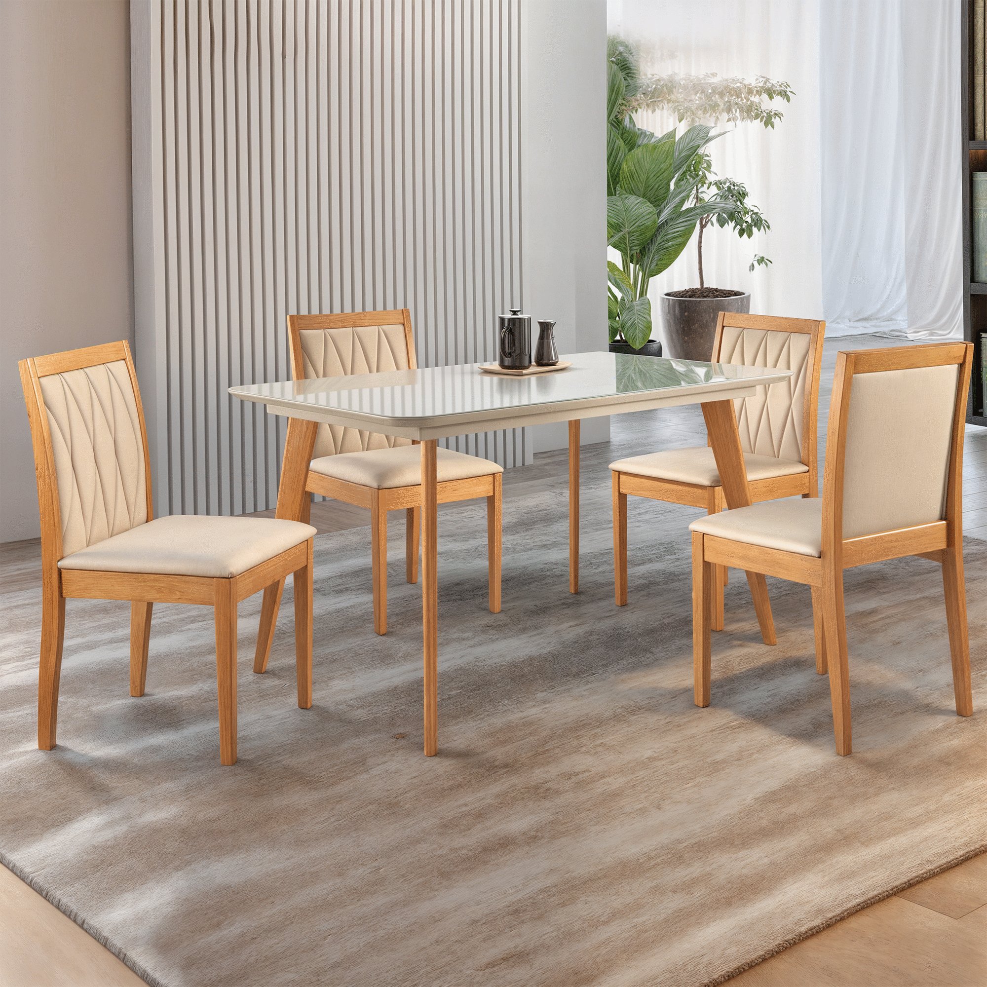 Conjunto Sala de Jantar Mesa Pérola Madeira Maciça Tampo em Vidro Offwhite com 4 Cadeiras Tecido Vel