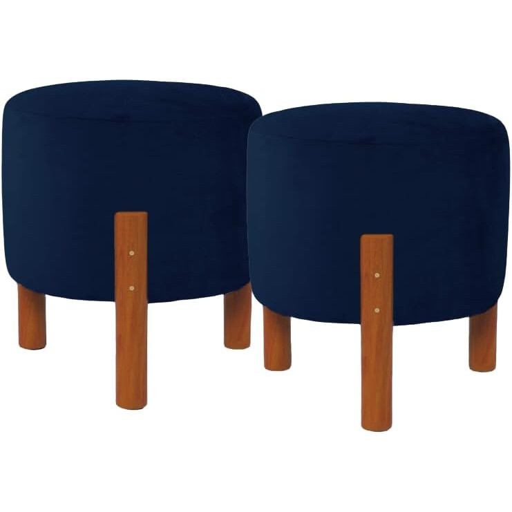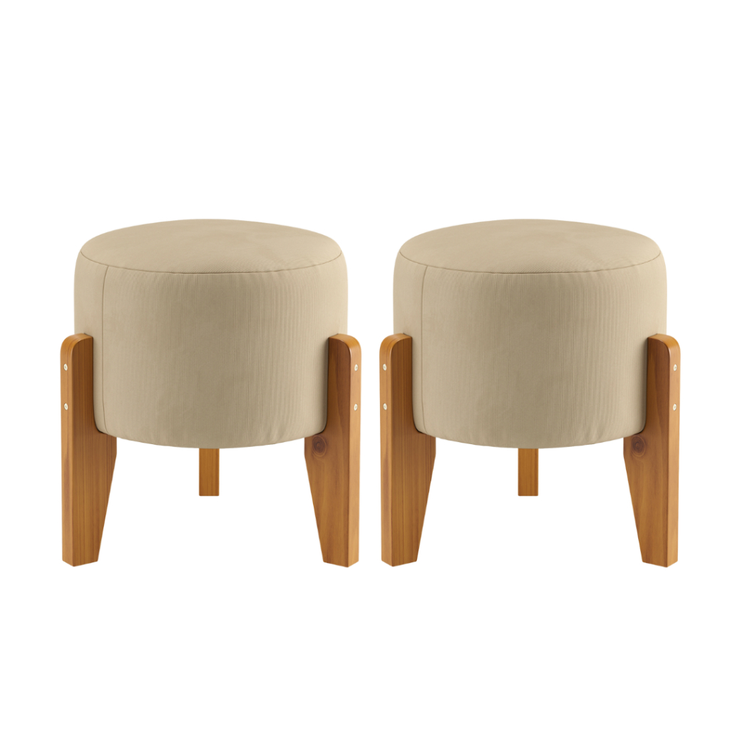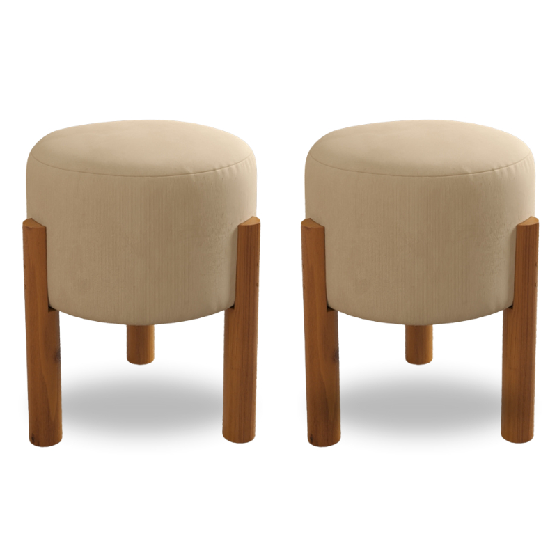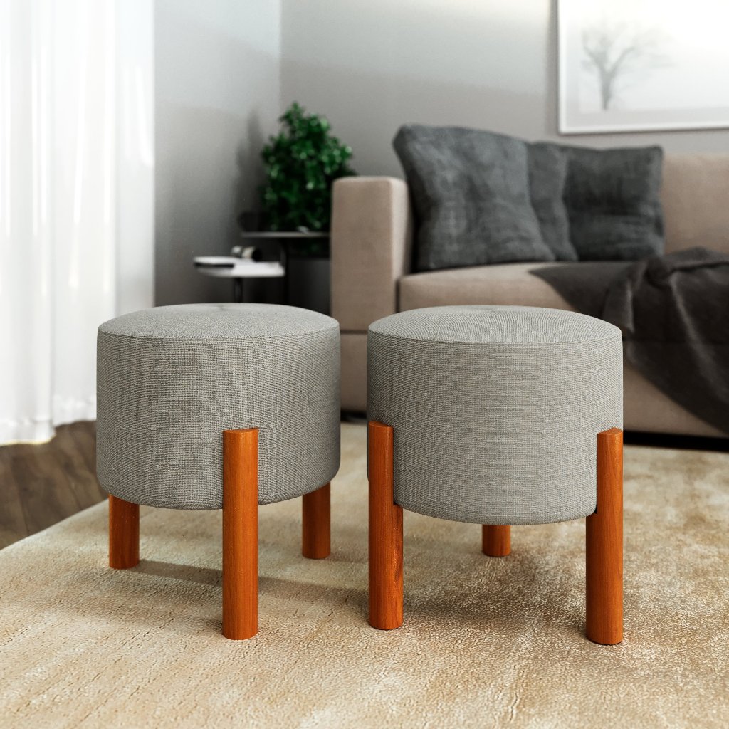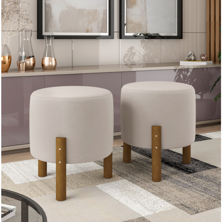 Kit 2 Puff Redondo Estofado Com Pés em Madeira Apoio Para os Pés