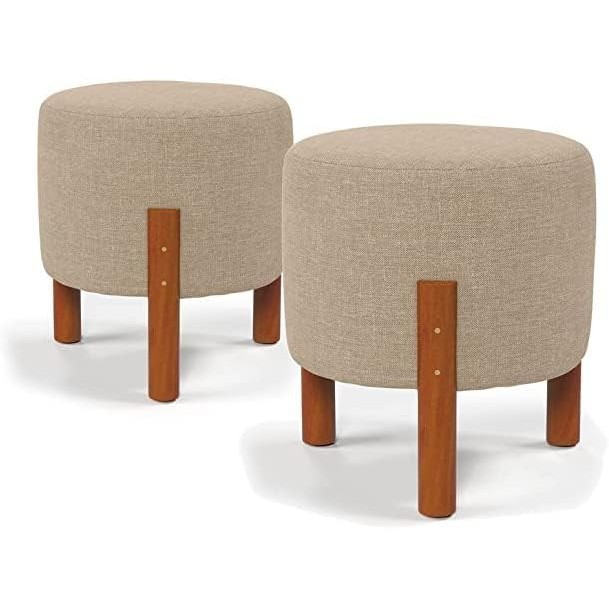 Kit 2 Puff Banqueta Banquinho Redondo Em Linho Bege Thor Luxo Pés de Madeira