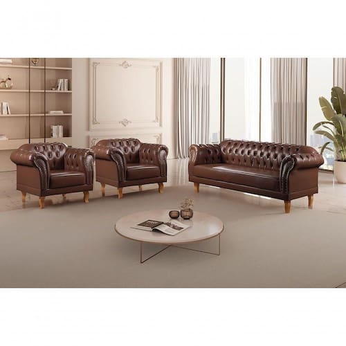 Conjunto Sofá Chesterfield 3 Lugares + 2 Poltronas couro Ecológico Marrom 301