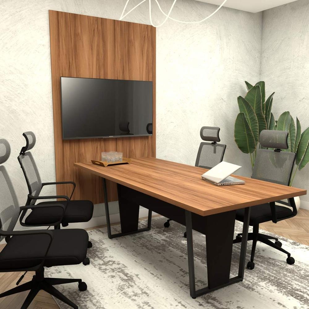 Conjunto Escritório Mesa de Reunião 2,50m e Painel para Tv F5 Office Cor:freijó com Preto
