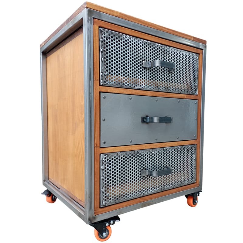 Mesa de Cabeceira Gaveteiro Modelo Cubo Industrial - Ferro e Madeira - com 3 Gavetas e 4 Rodízios