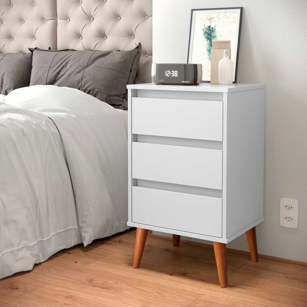 Mesa de Cabeceira Quarto Retro Wood 3 Gavetas Branco