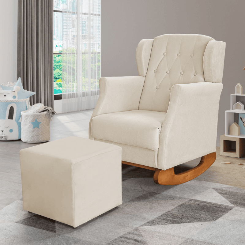 Poltrona para Amamentação Balanço com Puff Alana Suede Bege