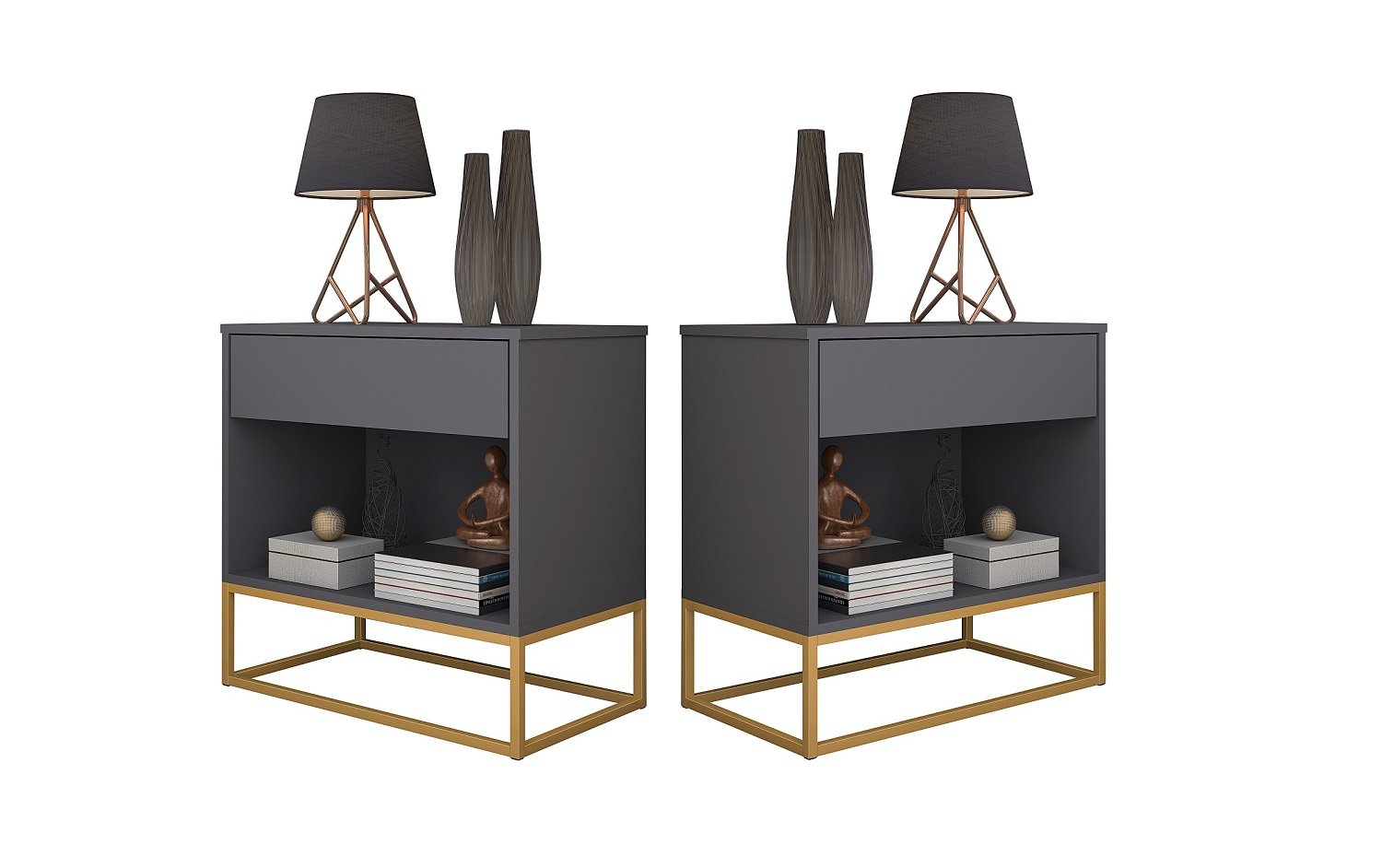 Kit 2 Mesa Lateral para Cama Criados Industrial Malta Cinza Pés de Ferro Dourado