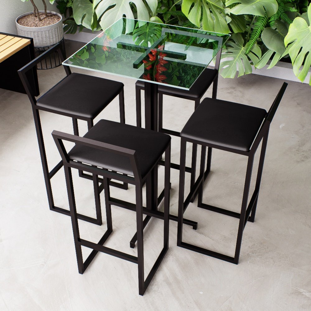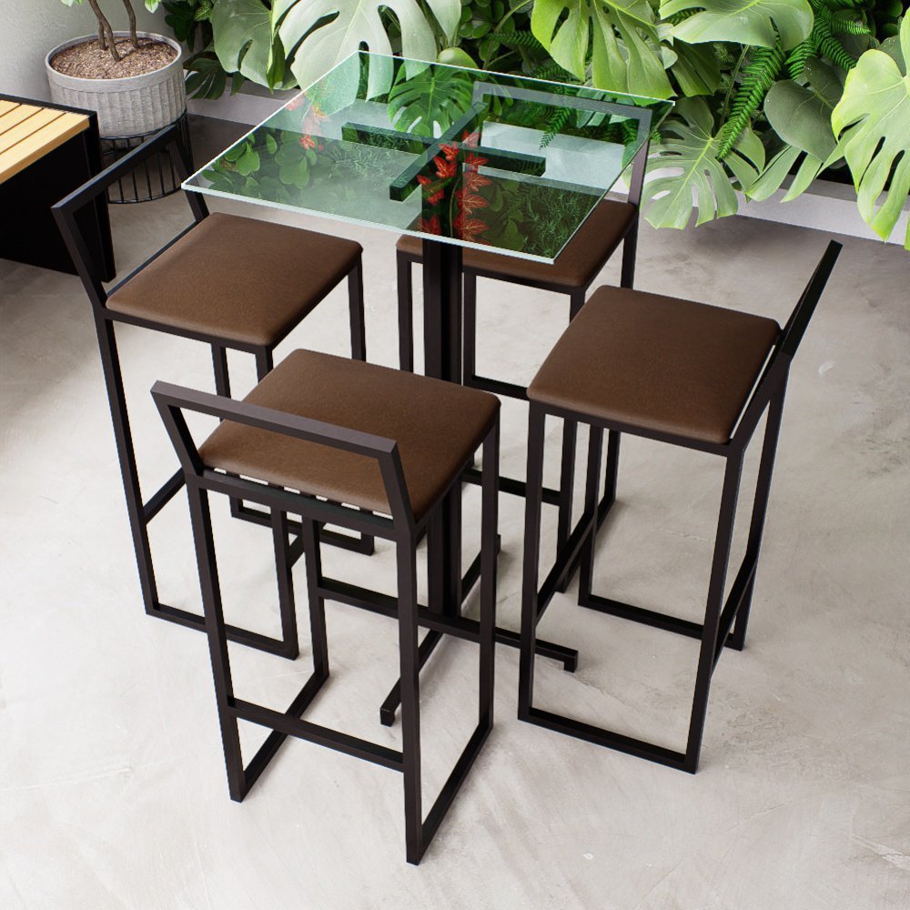 Conjunto Mesa Alta Bar Bistrô Quadrada Vidro 4 Banquetas Estofado Don Castro Decor