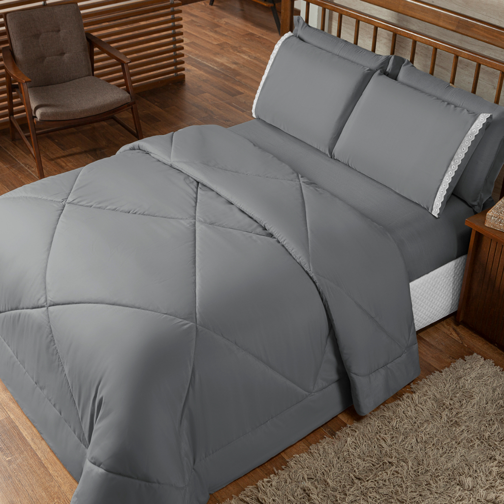 Kit Edredom Casal Queen Jogo de Lençol 06 Peças Aconchego Poliéster Cinza Varias Cores