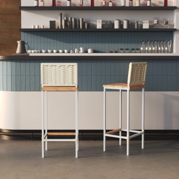 Conjunto 2 Banqueta Alta em Aço com Assento de Madeira Maciça Encosto de Junco Areia Branco, Areia