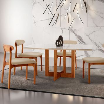 Conjunto de Mesa de Jantar Retangular com Tampo de Vidro Off White Agata e 4 Cadeiras Maia Linho Gengibre e Nature