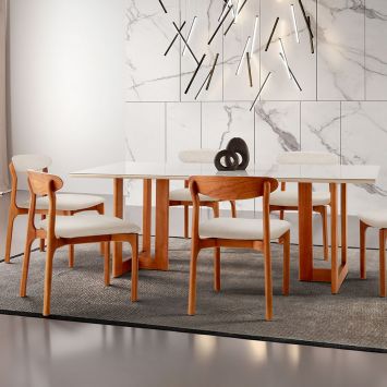 Mesa de Jantar Retangular com Tampo de Vidro Bárbara Ipê e Off White 135 cm