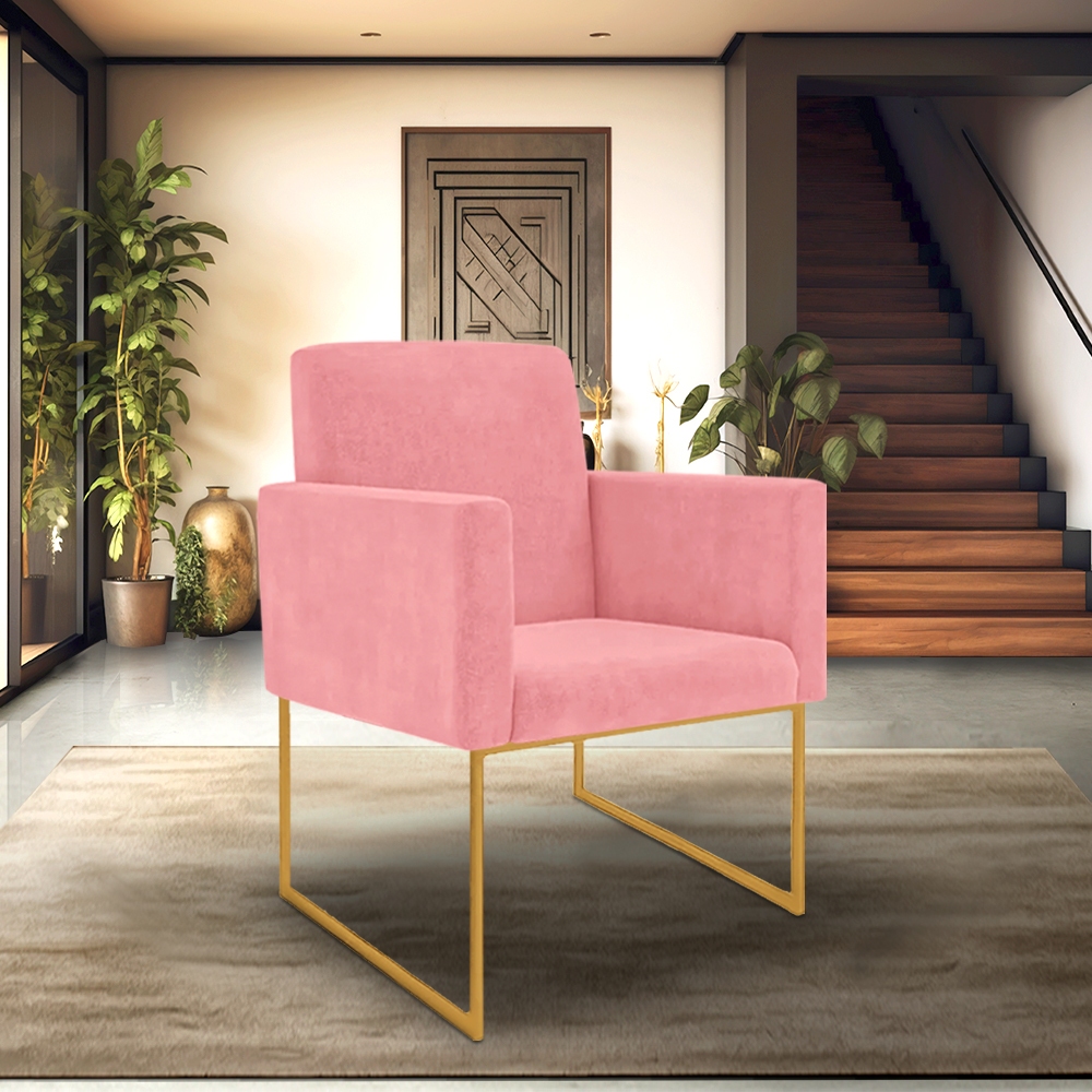 Poltrona Decorativa sala de estar cor suede Rosa - Base ferro Dourado