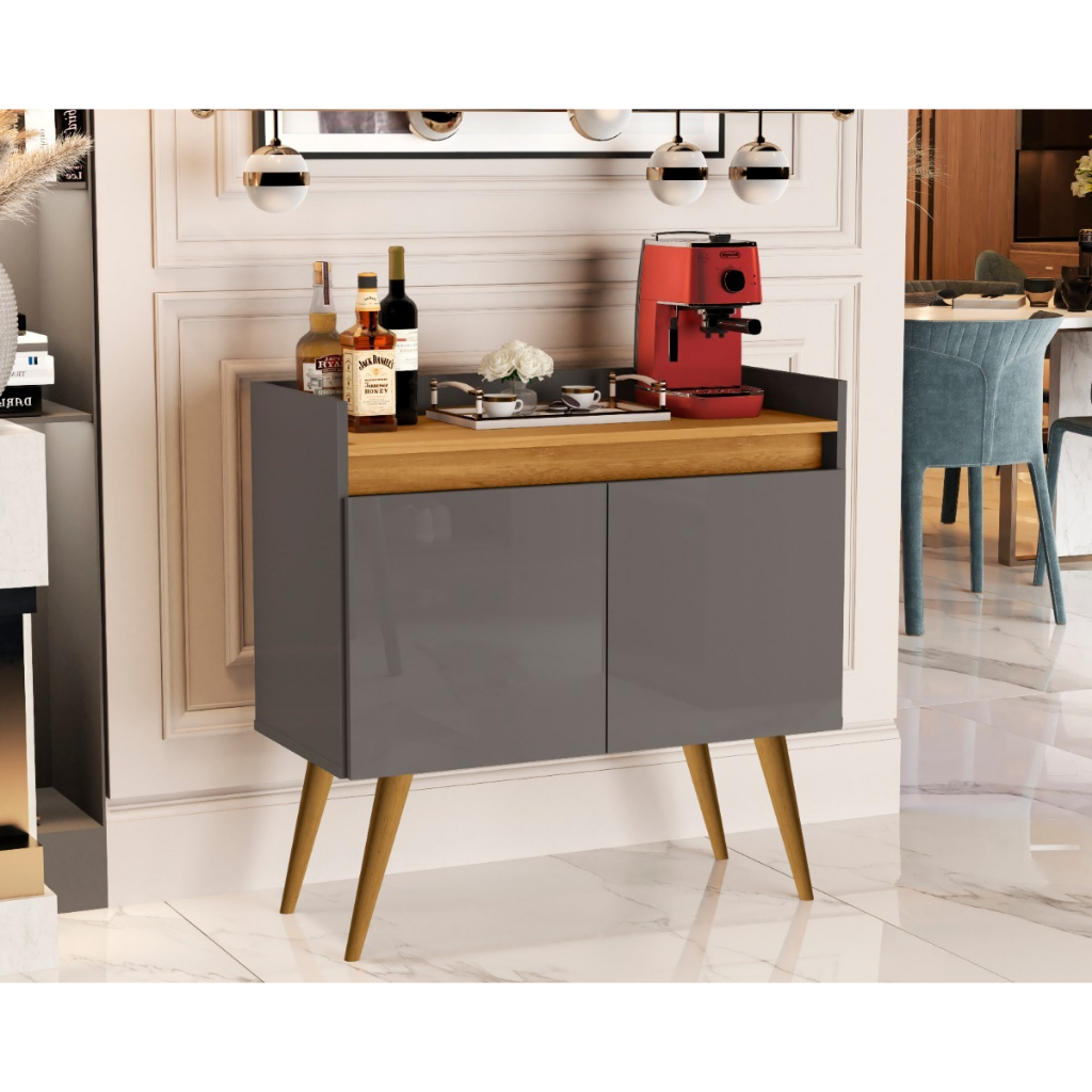 Aparador buffet com 2 portas e prateleiras cantinho do café cinza com mel e pés de madeira
