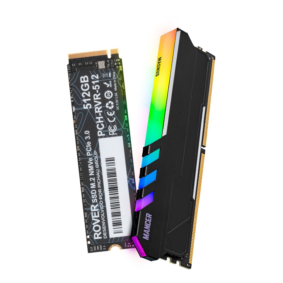 Kit SSD Pichau Rover, 512GB, M.2 2280, PCIe NVMe, Leitura 2100 MB/s, Gravacao 1400 MB/s, Memoria Mancer Magnus, RGB, 8GB (1x8GB), DDR4, 3200MHz, C16