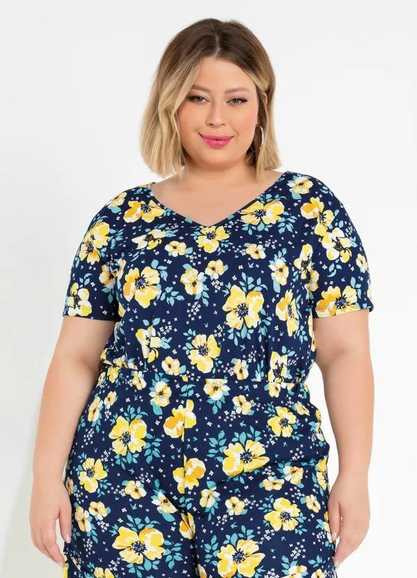Queima Estoque - Blusa Floral Azul com Decote V Plus Size