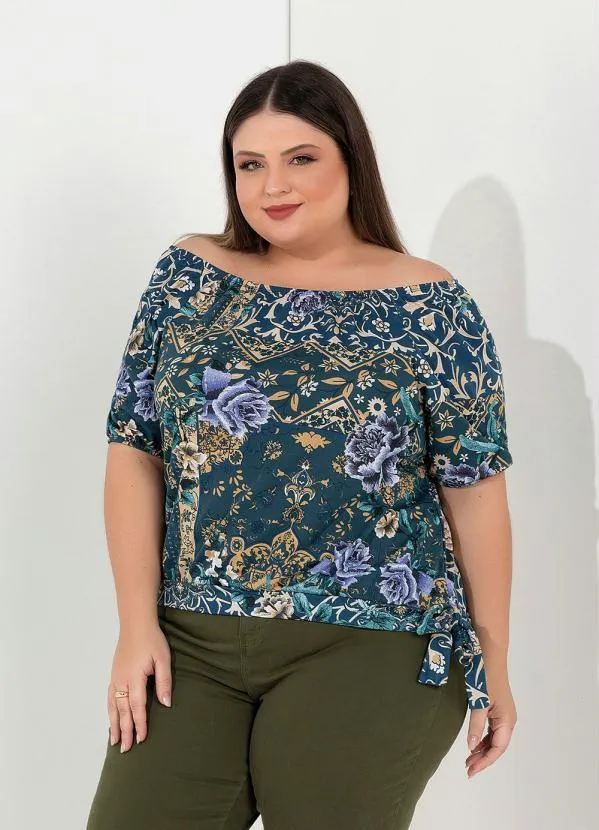 Queima Estoque - Blusa Floral Azul Decote Ombro a Ombro Plus Size