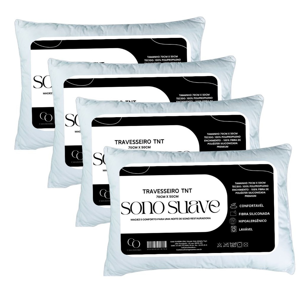 Kit 4 Travesseiros 50x70 Antialérgico 100% Fibra Siliconada Importada Lavável Macio TNT Luxo