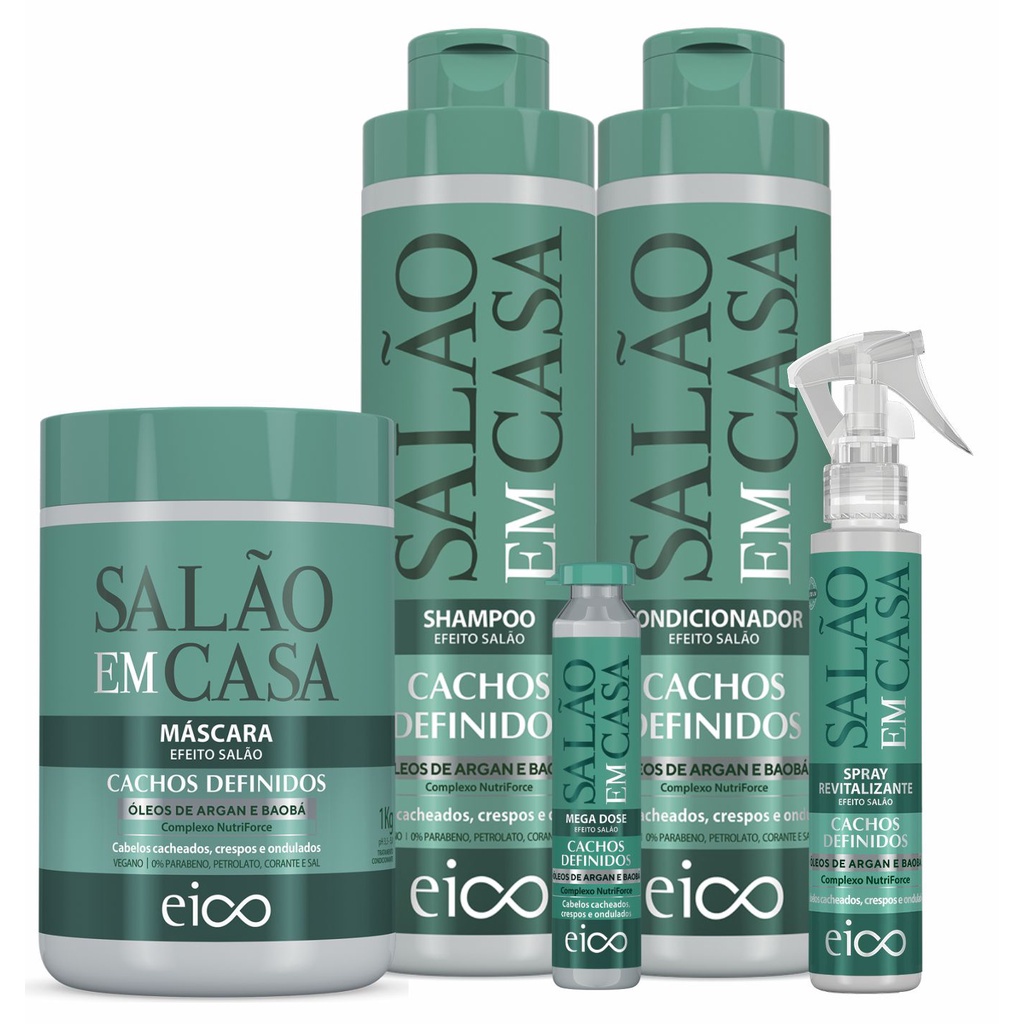 Kit Eico Salão em Casa Cachos Definidos Shampoo 800ml Condicionador 450ml Máscara 1Kg Spray 120ml