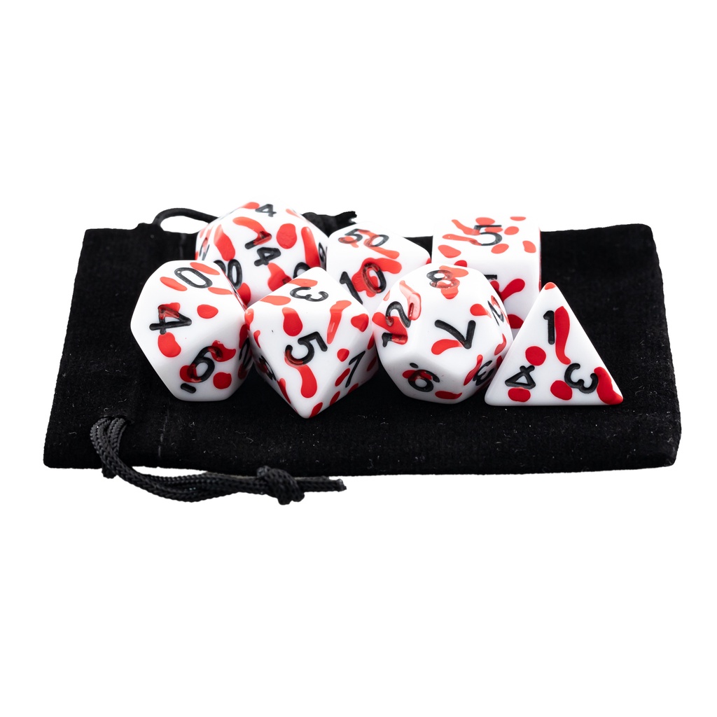 Kit 7 Dados RPG de Mesa Efeito Respingos de Sangue + 1 BOLSA | D4 D6 D8 D10 D10% D12 D20