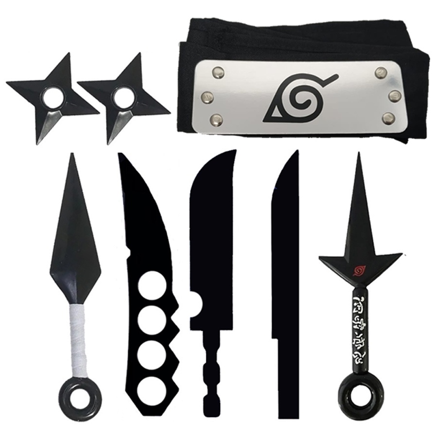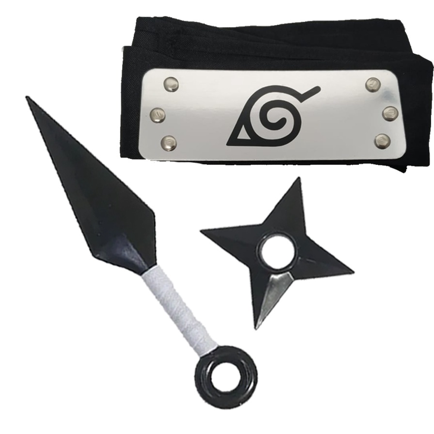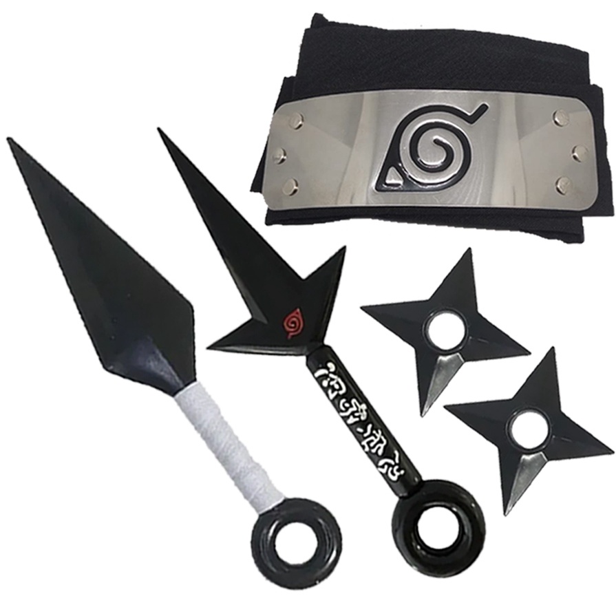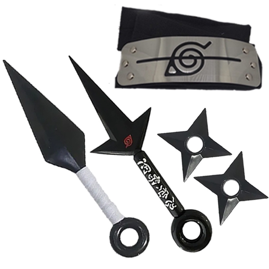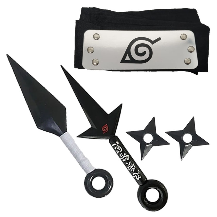 Kit com 5 Facas do Naruto + 2 Shurikens + Bandana da Vila da Folha Flexível