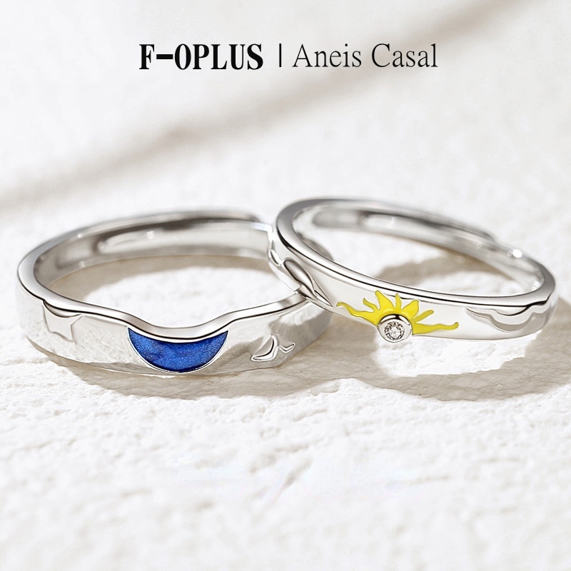 F-OPLUS | Aliança Sol e Lua Ajustável Par de Anel Aliança de Namoro Compromisso Lua e Sol com Caixa CRC073