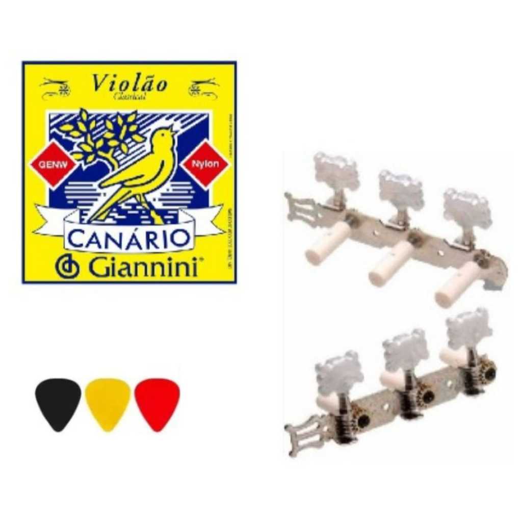 Encordoamento Cordas Violão Nylon Canário E Tarraxa Tarracha Pino Grosso 3 Palhetas