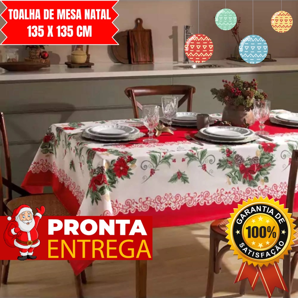 Toalha De Mesa Natal Decoração Para Mesa 4 Lugares Natalina Com Glitter Estampada 100% 135 cm x 135 cm Algodão E Poliéster