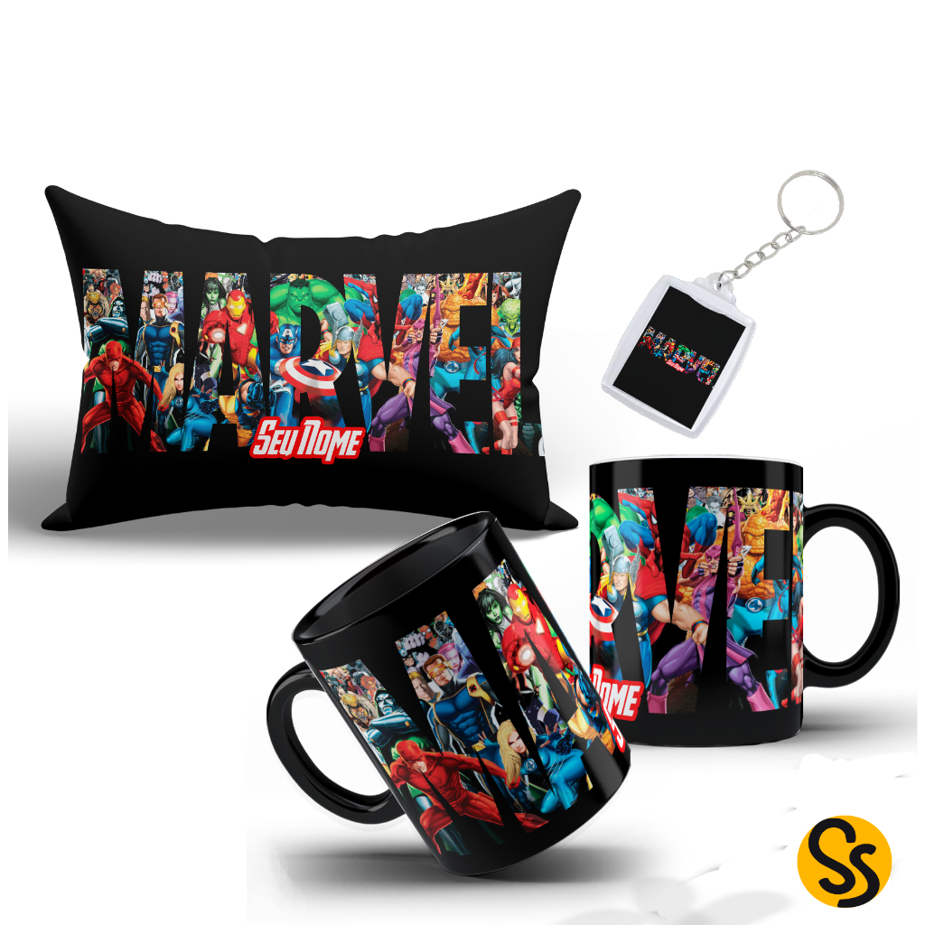 Kit Personalizado com Seu Nome Marvel com Caneca, Almofada e Chaveiro