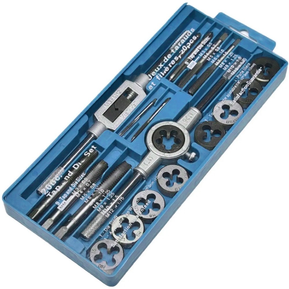 Jogo Kit De Tarraxas e Cossinetes Para Fazer Rosca Macho E Fêmea Em Aço Carbono 20 Peças Com Estojo