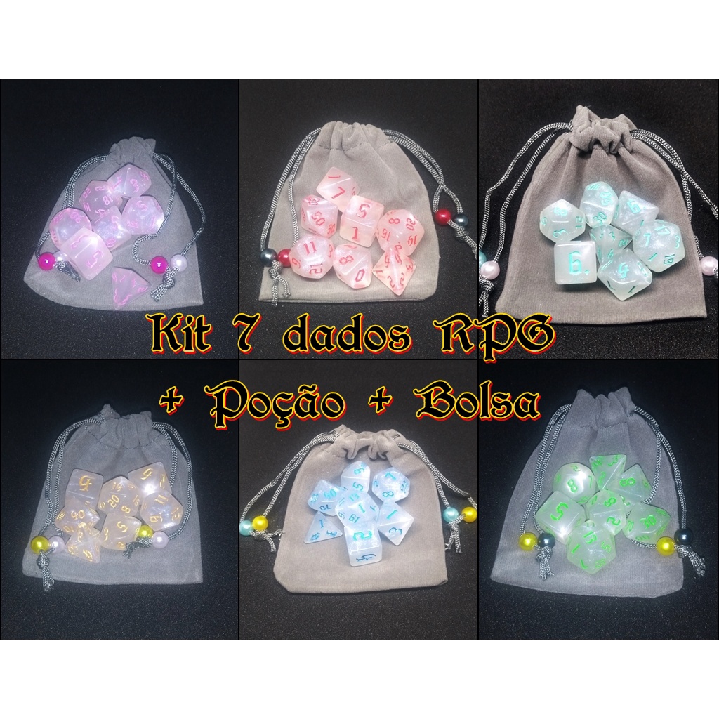 Kit 7 dados para RPG + Poção + Bolsa - D&D Dice Dungeons and Dragons