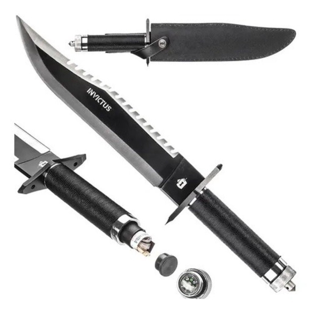Facão Sobrevivência Militar Faca Rambo Tático Caça E Pesca Camping Com Porta Objetos no cabo Lamina Preta Super Afiada
