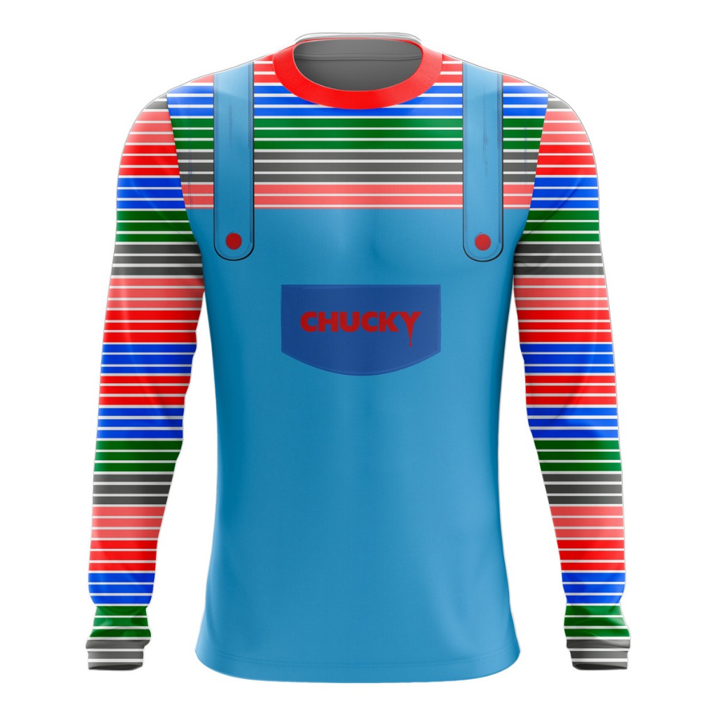 Camiseta Traje Chucky Halloween Fantasia Manga Longa Unissex Infatil Adulto Traje