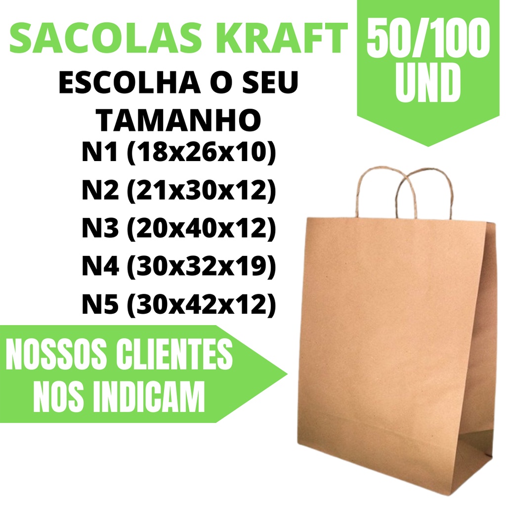 Sacola Kraft de Papel Com Alça Para Embalagem e Presentes Com 50 ou 100 Unidades
