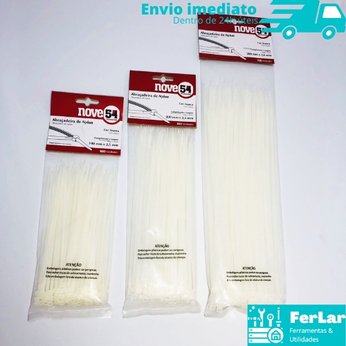Abraçadeira de Nylon, Branca, Alta Resistencia, 100 Peças (140mm x 2,5mm), (200mm x 2,5), (280mm x 3,6mm), Lacre, Enforca Gato, Fixação Diversas